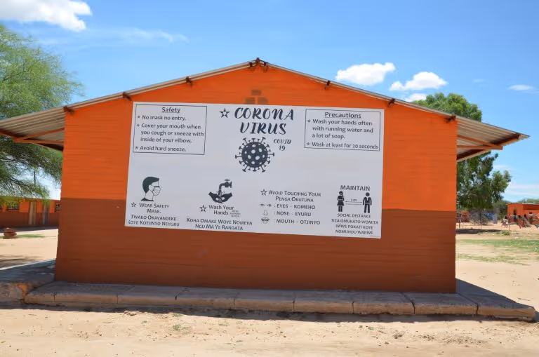 An die wichtigen Hygiene Regeln werden unsere namibischen Schulkinder anhand dieses großen Plakats, das an einem Gebäude befestigt ist, immer wieder erinnert.